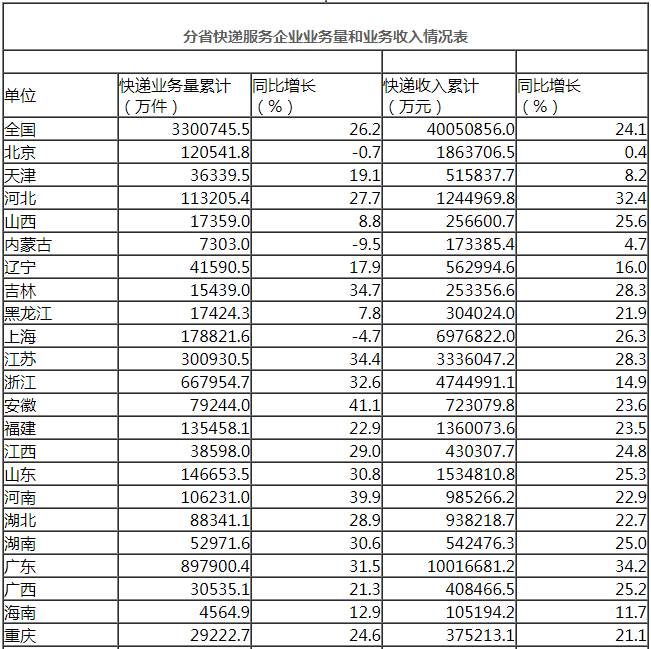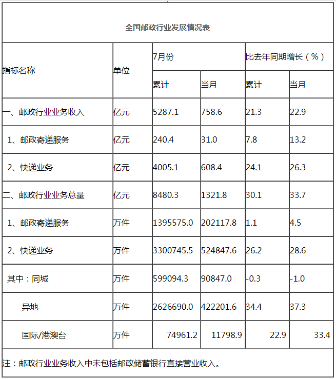 7月份,郵政服務業務總量完成191.4億元,同比增長21.9%;郵政寄遞服務業務量完成20.2億件,同比增長4.5%;郵政寄遞服務業務收入完成31億元,同比增長13.2%。