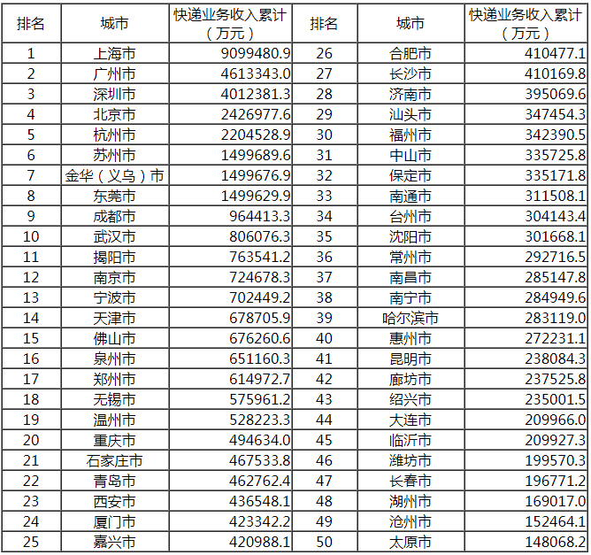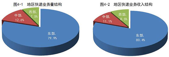 1-9月,東、中、西部地區快遞業務量比重分別為79.9%、12.6%和7.5%,業務收入比重分別為80.4%、11.1%和8.5%。與去年同期相比,東部地區快遞業務量比重下降0.1個百分點,快遞業務收入比重上升0.4個百分點;中部地區快遞業務量比重上升0.5個百分點,快遞業務收入比重下降0.1個百分點;西部地區快遞業務量比重下降0.4個百分點,快遞業務收入比重下降0.3個百分點。