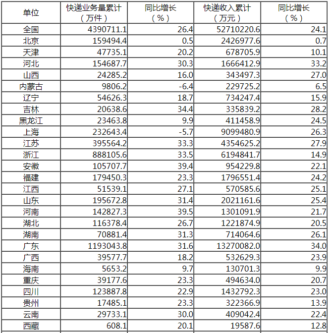 9月份,全國快遞服務企業業務量完成56億件,同比增長25%;業務收入完成649.2億元,同比增長22.2%。