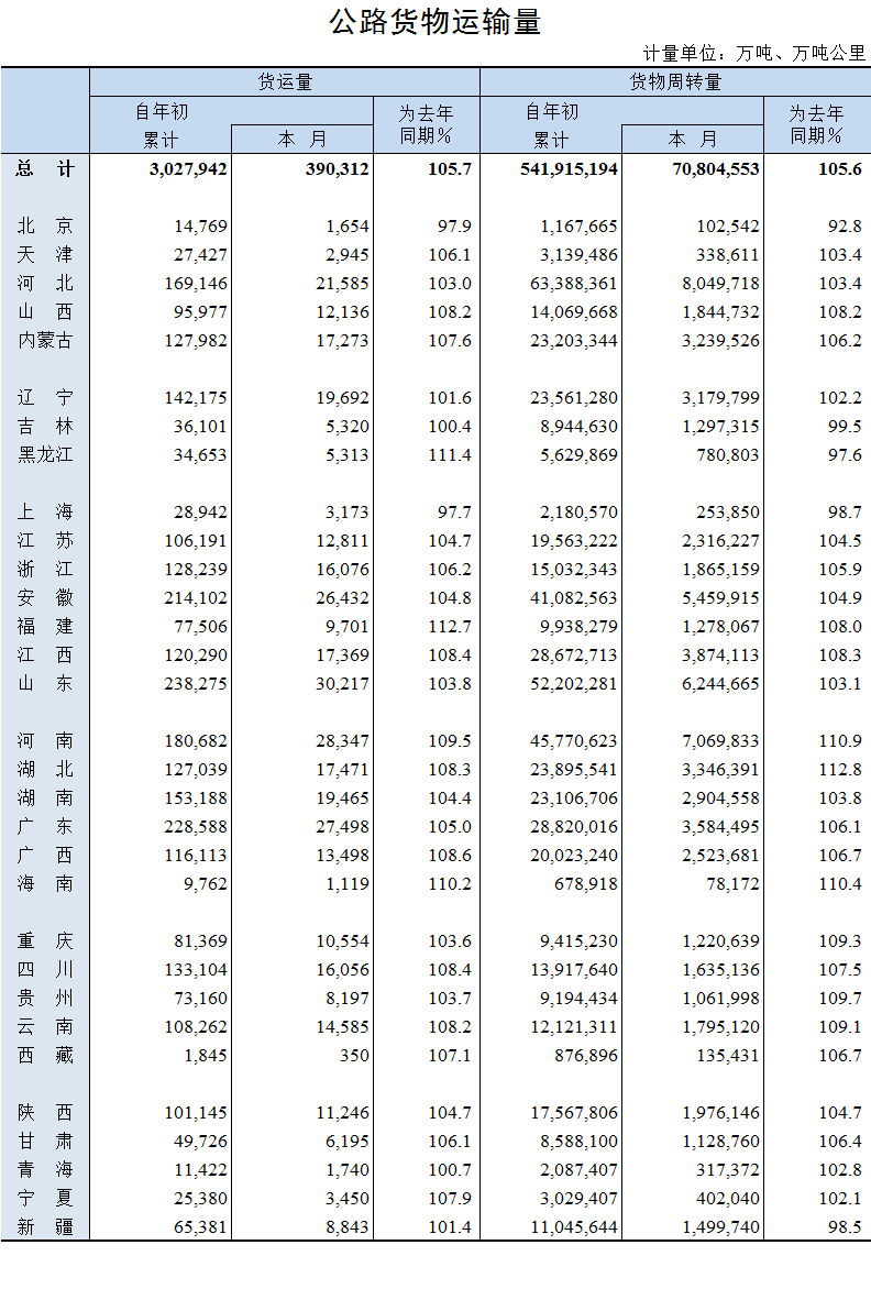 2019年9月公路貨物運輸量