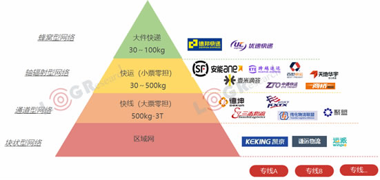 大件市場開始逐步分化,經過近20年的發展形成了小票零擔市場(30-500公斤/票)、大票零擔市場(500公斤-3噸/票)和整車市場(3噸以上)的細分,小票零擔對應的公司組織形式是快運,專線依靠其在大重量段的成本優勢,退守大票零擔和整車市場。