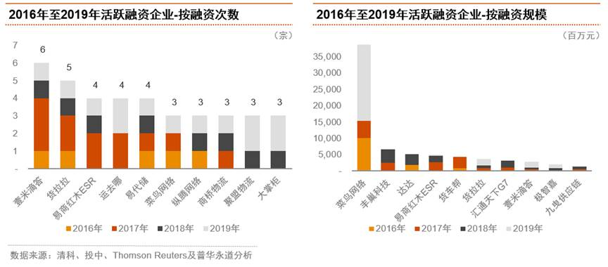 2016年至2019年物流行業活躍投資者為普洛斯/隱山資本、阿里系、順豐控股、鐘鼎創投、遠洋資本和京東等,以產業投資者為主。2019年,上述企業共參與了23宗交易,交易數量較2018年減少,但交易規模則逆勢增長,一定程度反映出重要投資者對物流行業長遠發展潛力仍具信心。