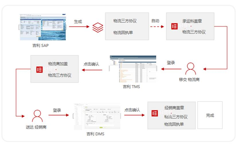 吉利承運(yùn)科負(fù)責(zé)整車物流,物流商&經(jīng)銷商&承運(yùn)科實(shí)名認(rèn)證均由e簽寶提供認(rèn)證服務(wù),確保合同簽署主體的真實(shí)性,電子簽名全過(guò)程由e簽寶提供服務(wù),包括合同模板填充,合同查看,簽署完成為提升簽署效率、減少人力、紙張成本,同時(shí)解決了易丟失,不易保管,事后可追溯性差等問(wèn)題。