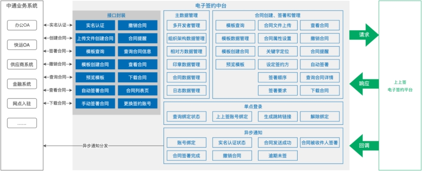 該系統(tǒng)中由上上簽電子簽約提供實(shí)名認(rèn)證、證書發(fā)放、合同簽署等基礎(chǔ)服務(wù)能力。中通依托于上上簽電子簽約提供的標(biāo)準(zhǔn)接口和基礎(chǔ)服務(wù),進(jìn)行二次開發(fā)和封裝,搭建企業(yè)電子簽約中臺,根據(jù)自身信息化建設(shè)需求,將電子簽約作為一項(xiàng)基礎(chǔ)服務(wù)提供給各業(yè)務(wù)系統(tǒng)使用,方便各業(yè)務(wù)系統(tǒng)快速調(diào)用和接入。