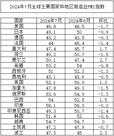 2024年7月份全球主要國家制造業PMI