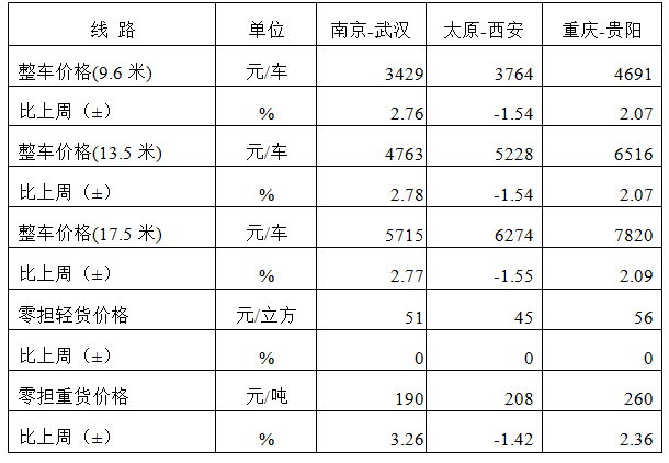 分車型看,各車型指數環比略微回升。其中,整車指數為1046.69點,比上周回升0.04%;零擔輕貨指數為1028.44點,比上周回落0.02%;零擔重貨指數為1046.27點,比上周回升0.03%。