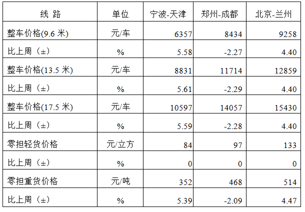 分車型看,各車型指數環比小幅回升。其中,整車指數為1048.69點,比上周回升0.19%;零擔輕貨指數為1028.62點,比上周回升0.02%;零擔重貨指數為1049.02點,比上周回升0.26%。