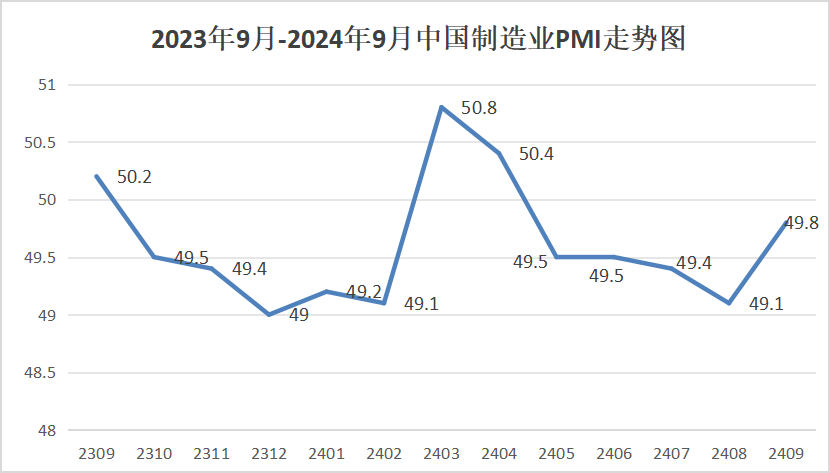 中國物流與采購聯(lián)合會、國家統(tǒng)計局服務業(yè)調(diào)查中心發(fā)布的2024年9月份中國制造業(yè)采購經(jīng)理指數(shù)(PMI)為49.8%,比上月上升0.7個百分點。