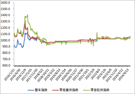 分車型看,各車型指數環比小幅回升。其中,整車指數為1062.89點,比上周回升1.28%;零擔輕貨指數為1042.42點,比上周回升1.29%;零擔重貨指數為1062.67點,比上周回升1.29%。