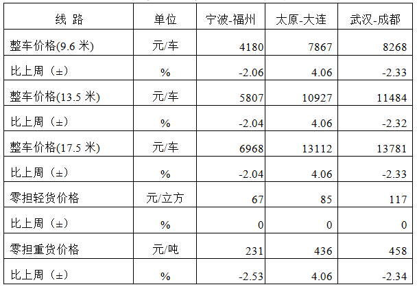 分車型看,各車型指數環比小幅回落。其中,整車指數為1049.90點,比上周回落1.26%;零擔輕貨指數為1028.66點,比上周回落1.30%;零擔重貨指數為1050.51點,比上周回落1.17%。