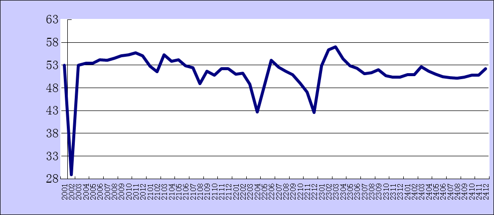 中國物流與采購聯合會、國家統計局服務業調查中心采購經理調查發布的2024年12月份綜合PMI產出指數為52.2%,比上月上升1.4個百分點。該指數是PMI指標體系中反映當期全行業(制造業和非制造業)產出變化情況的綜合指數,由制造業生產指數與非制造業商務活動指數加權求和而成,權數分別為制造業和非制造業占GDP的比重。
