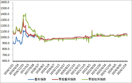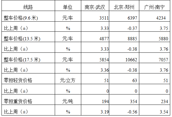 分車型看,各車型指數(shù)環(huán)比有所增長。其中,整車指數(shù)為1053.72點,比上周回升0.06%;零擔(dān)輕貨指數(shù)為1027.80點,比上周回升0.01%;零擔(dān)重貨指數(shù)為1054.31點,比上周回升0.15%。