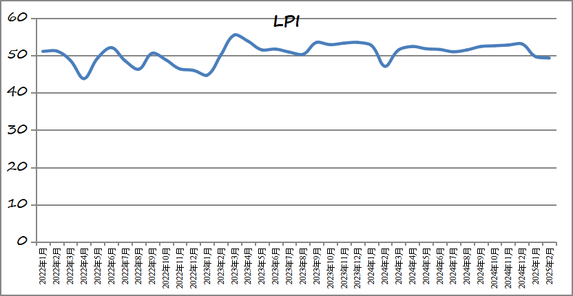 中國物流與采購聯合會發布的2025年2月份中國物流業景氣指數為49.3%,較上月回落0.4個百分點。受季節性因素影響,本月工作日較少,指數有所回落,隨著節后復工有序推進,各地區重大項目集中開工,產業鏈上下游平穩復蘇,2月下旬實物量指標明顯上升。