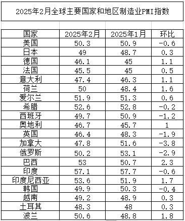 2025年2月全球主要國家制造業PMI