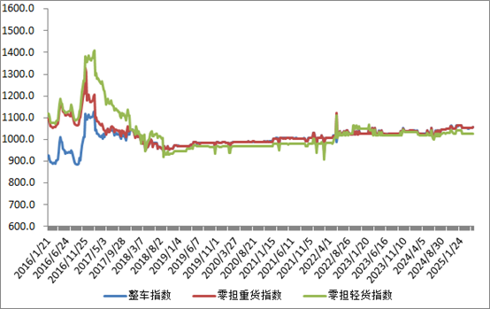 分車型看,各車型指數(shù)環(huán)比漲跌互現(xiàn)。其中,整車指數(shù)為1055.40點(diǎn),比上周回升0.13%;零擔(dān)輕貨指數(shù)為1027.34點(diǎn),比上周回落0.03%;零擔(dān)重貨指數(shù)為1055.72點(diǎn),比上周回升0.19%。