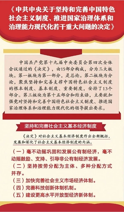 ??黨的十九屆四中全會聚焦堅持和完善支撐中國特色社會主義制度的根本制度、基本制度、重要制度,首次將按勞分配為主體、多種分配方式并存和社會主義市場經濟體制納入基本經濟制度,進一步拓展了我國基本經濟制度的內涵。