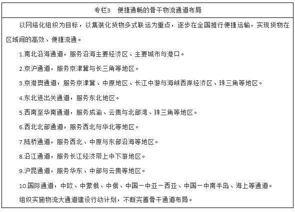 構建便捷通暢的骨干物流通道。依托綜合運輸大通道,率先推進集裝化貨物多式聯運。編制實施推進物流大通道建設行動計劃和鐵路集裝箱運輸規劃,做好骨干物流通道布局,到2020年初步形成集裝箱運輸骨干通道。在長三角、珠三角等客貨流密集地區,研究推進客貨分流的鐵路、公路通道建設。有序推進面向全球、連接內陸的國際聯運通道建設,加強口岸后方通道能力建設,開辟一批跨境多式聯運走廊。