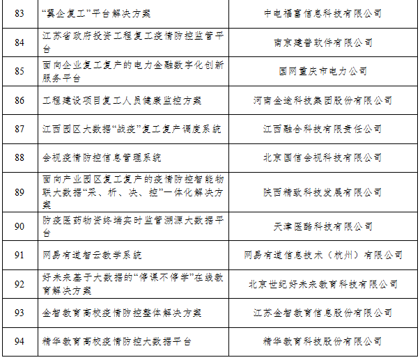 根據《工業和信息化部辦公廳關于組織開展支撐疫情防控和復工復產復課大數據產品和解決方案征集工作的通知》(工信廳信發函〔2020〕31號)要求,經各單位推薦、專家組評審、網上公示等環節,現將“‘一網暢行’疫情防控和復工復產大數據系統”等94個疫情防控和復工復產復課大數據產品和解決方案予以公布。