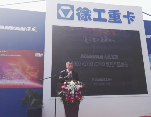 下午2時,以“追風逐日·款款動人”為主題的HANVAN漢風家族系列產品發布會在商用車展區舉行,徐工集團汽車事業部總經理、黨委書記羅東海先生發表了致辭,徐工集團汽車事業部總工程師汪建先生發布了HANVAN漢風家族G900/G700/G500系列產品。隨后,在徐工重卡新基地剪影和金色巨人奔跑的背景中,徐工重卡啟動了HANVAN漢風家族全系產品的全面上市。HANVAN漢風家族三大系列產品首次同臺震撼亮相,吸引了媒體眼球。