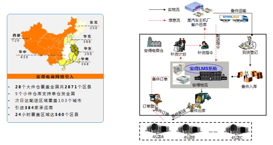 ▲ 安得物流與某汽車主機(jī)廠備件合作案例。通過(guò)引入安得電商物流網(wǎng)絡(luò),將客戶備件輸送至吉利全國(guó)門店,并將退件回收。