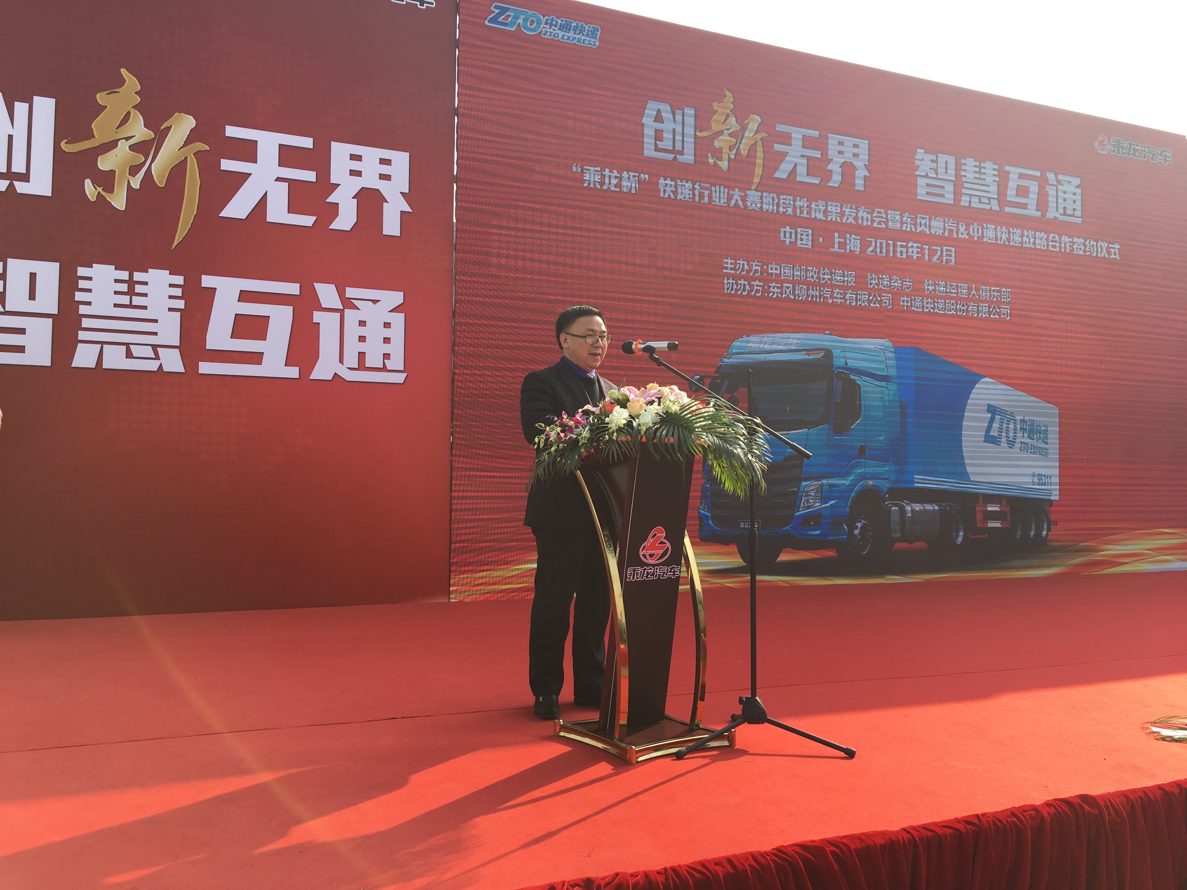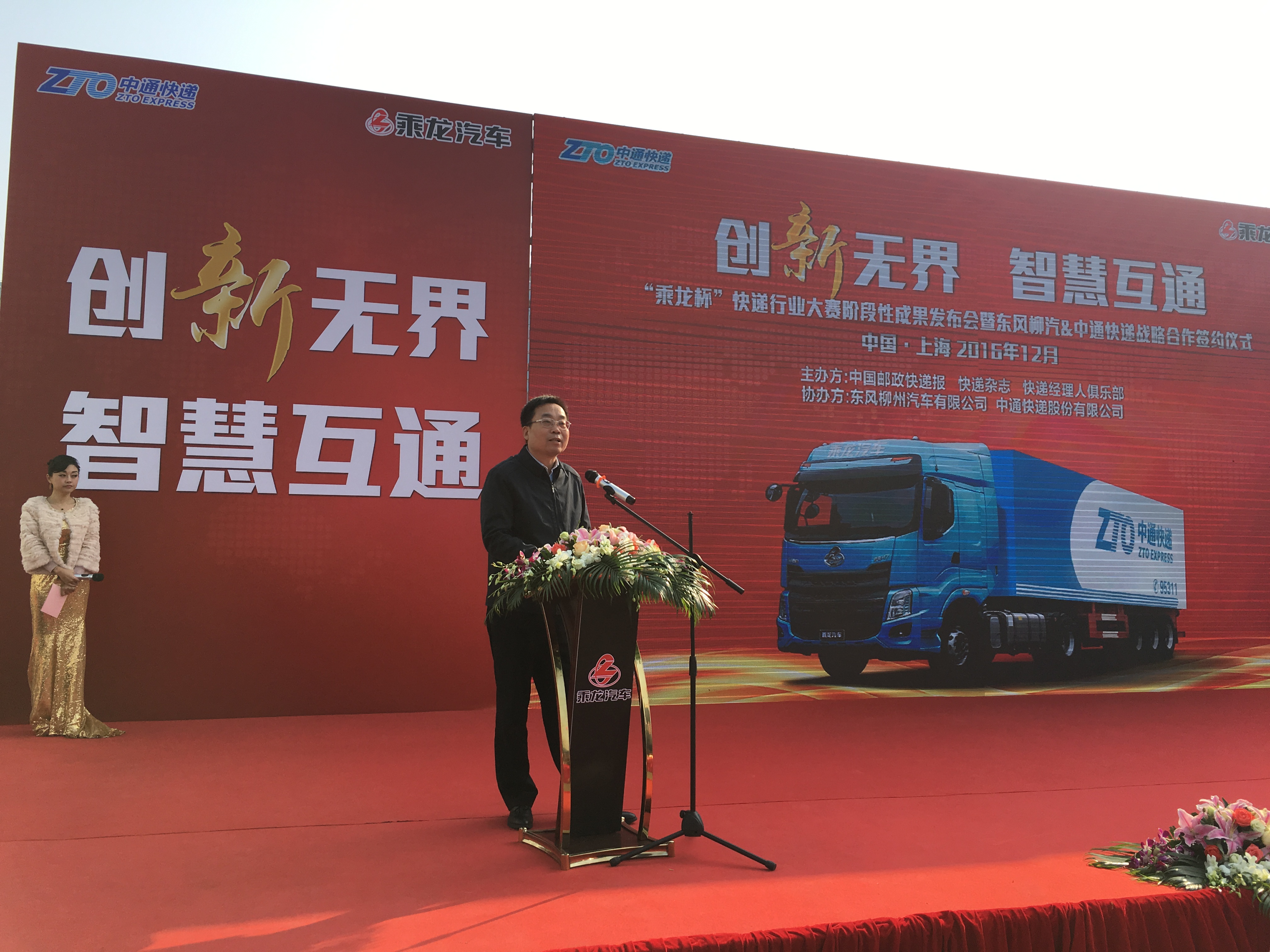 12月29日,“創新無界,智慧互通——‘乘龍杯’快遞行業大賽階段性成果發布會暨東風柳汽&中通快遞戰略合作簽約儀式”于中通快遞上海總部召開。中國郵政快遞報社副社長陰志華,中通快遞董事長賴梅松,東風柳汽副總經理姚利文等高層領導蒞臨現場,三方針對當下快遞物流行業的現狀和發展進行了全面探討,現場氣氛熱烈,盛況非凡。