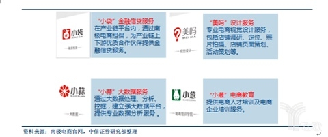 服務電商版塊,南極電商稱之為:生態綜合服務平臺。主要針對兩類用戶:供應商和銷售商,提供一站式生態服務,從產品研發、品質管控、大數據分析、運營計劃,到視覺展示、流量推廣、數據平臺、APP、用戶體驗、活動策劃及客戶關系管理,以面帶點,由點及面,讓電商企業得到全方位的服務體驗。