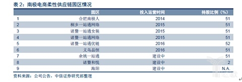 電商產業園版塊,南極電商稱之為:柔性供應鏈服務平臺。服務平臺是由眾多產業帶園區組成,園區由南極電商主導,持股比例51%以上。