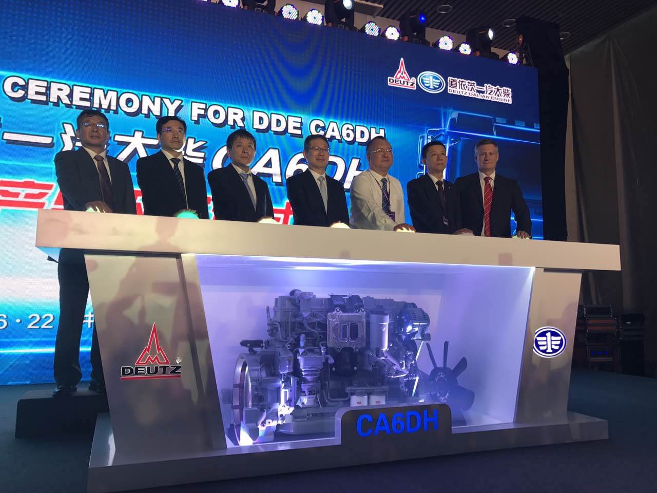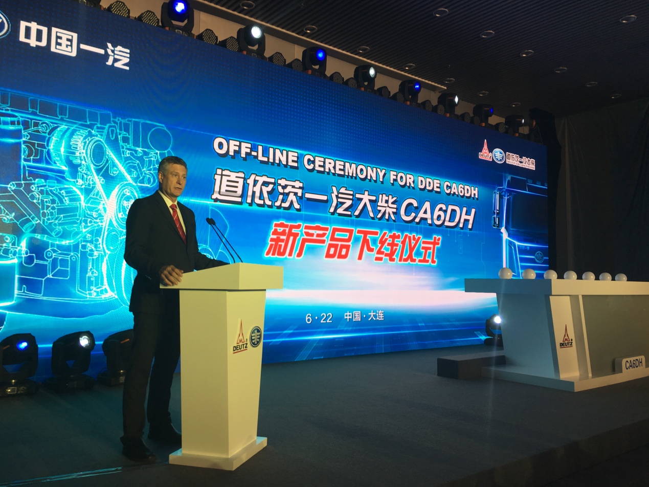 下線儀式由道依茨一汽大柴副總經理黃南翔主持,道依茨一汽大柴總經理席慕思先生首先致歡迎詞,一汽解放公司總經理、黨委書記胡漢杰先生發(fā)表重要講話。道依茨一汽大柴研發(fā)部部長Kaiser先生和道依茨一汽大柴質量保證部部長Aras先生分別進行產品和品質管理方面的介紹。之后,在現(xiàn)場所有嘉賓的共同見證下,主要領導共同為新產品揭幕,標志著為滿足最新排放標準而研制開發(fā)的6DH新產品正式下線。這也標志著在國家全面實施國五排放法規(guī)之際,道依茨一汽大柴將憑借這一全新產品搶抓機遇、引領市場。