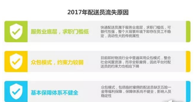 維持穩定的配送員團隊,對于配送平臺的發展至關重要。但目前即時物流行業存在配送人員流失率高的難題。究其原因,存在以下三方面的因素:求職門檻低、可替代性強,平臺對人員的約束力較弱以及基本保障體系不健全。