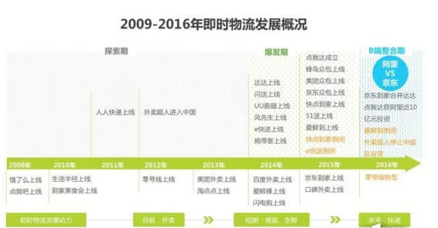 2、即時物流行業在歷經探索期、爆發期、整合期后,形成阿里和京東兩軍對壘局面,點我達、新達達、美團等成為行業主流玩家;