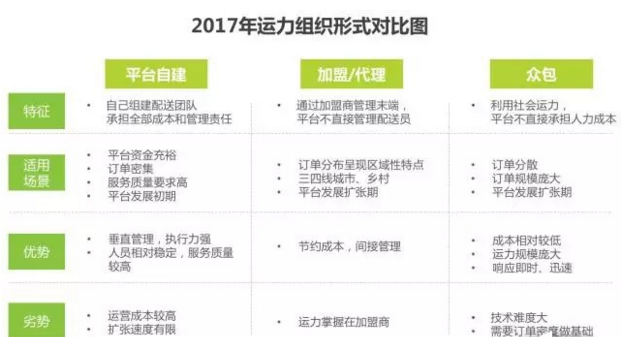 快速成長階段,O2O平臺多選擇混合模式,同時使用自建、加盟/代理、眾包模式,以自有運力保證基本運行,通過加盟代理和眾包模式迅速擴大運力。三種方式對應不同的管理顆粒度,有各自的適用場景。