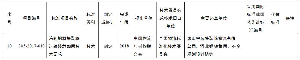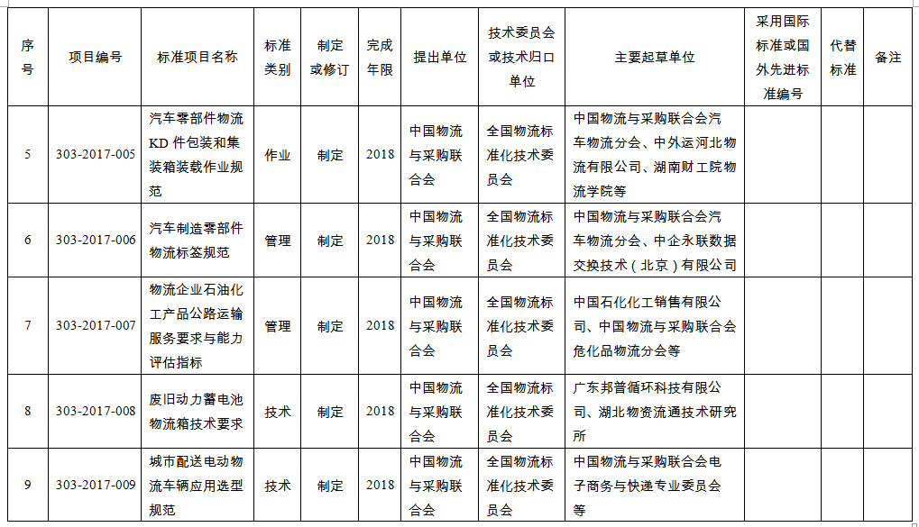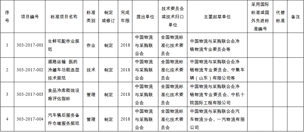 二、本計劃所列標準項目由中國物流與采購聯合會提出,全國物流標準化技術委員會組織專家進行了前期評審。列入2017年推薦性行業標準項目計劃共10項,涉及汽車物流、醫藥物流、石油化工物流、鋼鐵物流、物流裝備等物流服務、技術和管理標準。