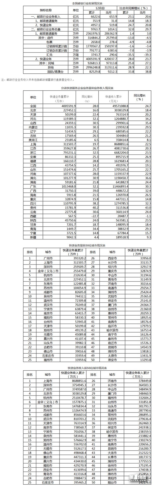 12月份,郵政服務業務總量完成159.1億元,同比增長30.4%;郵政寄遞服務業務量完成20.6億件,同比增長3%;郵政寄遞服務業務收入完成31億元,同比增長18.3%。