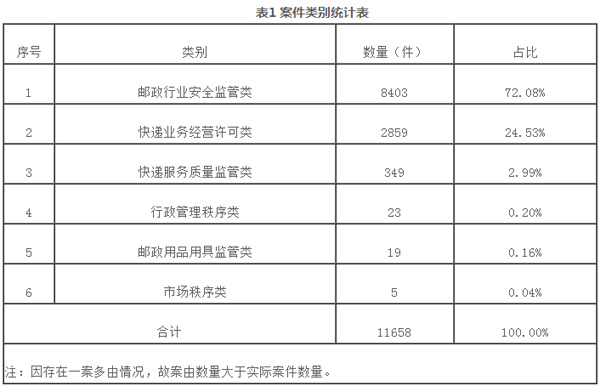 按照郵政市場行政處罰案件類別統計,各類案件數量依次為:郵政行業安全監管類件8403件,快遞業務經營許可類2859件,快遞服務質量監管類349件,行政管理秩序類23件,郵政用品用具市場監管類19件,市場秩序類5件。具體情況見表1。