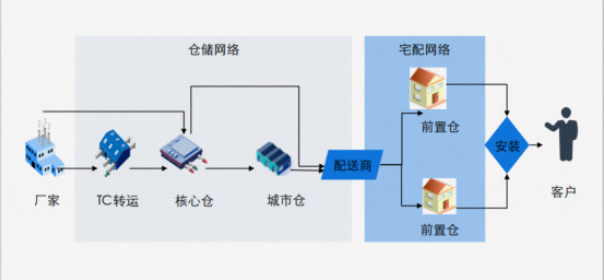 大家電B2C物流模式以倉配一體為主,運(yùn)營上則主要由倉儲(chǔ)網(wǎng)絡(luò)和宅配網(wǎng)絡(luò)兩部分構(gòu)成
