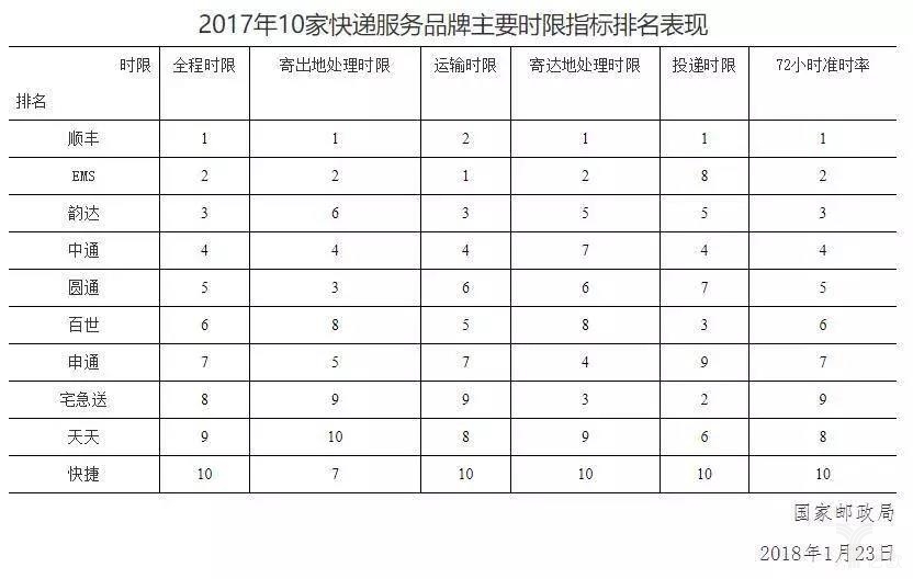 2017年10家快遞服務品牌主要時限指標排名表現