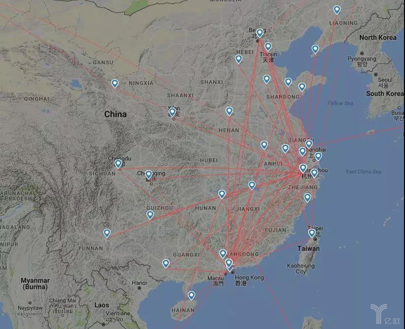 順豐空運網絡主要航線圖(可以看到杭州和深圳的航線最為密集)