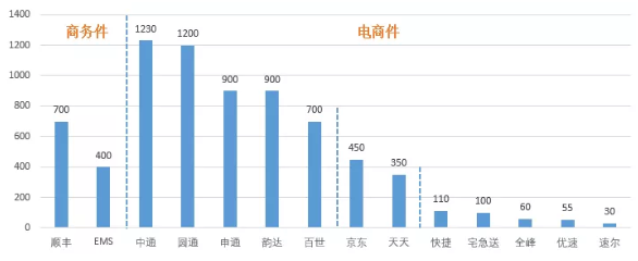 如上圖主要快遞企業(yè)日均件量,順豐達(dá)到700萬件,中通和圓通均超過1200萬件,逐年遞增的業(yè)務(wù)量要求快遞公司必須具備強(qiáng)大的物流處理能力,而這些必須借助自動(dòng)化設(shè)備的力量來實(shí)現(xiàn)。自動(dòng)化設(shè)備普及率及程度越高,人效越高,節(jié)省成本也越多。幾大物流公司的實(shí)踐也證明,自動(dòng)化分揀設(shè)備的引入可以大大提高單人分揀效率,從而降低中轉(zhuǎn)成本,提高整體運(yùn)營(yíng)效率。