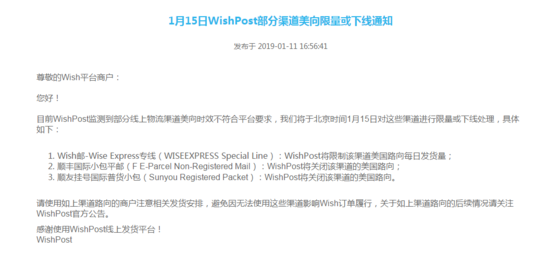 1月14日消息,WishPost發布公告,稱將于明日對Wish郵-Wise Express專線、順豐國際小包平郵、順友掛號國際普貨小包等渠道進行限量或下線處理。