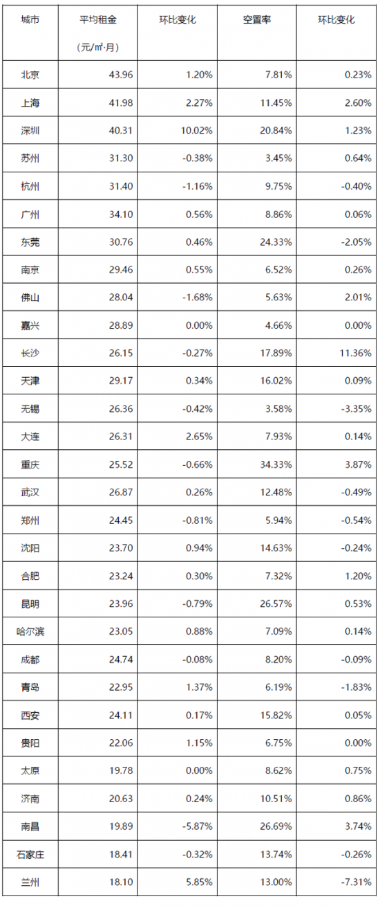 表:全國30個城市平均租金和空置率一覽表