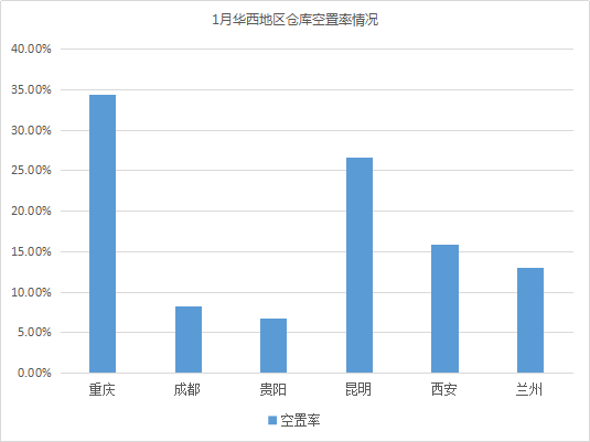 倉庫空置率最高的城市為重慶、南昌、昆明,均超26%。與上月相比,昆明倉庫空置率變化不大;重慶倉儲市場長期處于供大于求狀態(tài),倉庫空置率居高不下,延續(xù)上月上漲趨勢;南昌倉庫資源持續(xù)相對充足,倉庫空置率長期處于高位,加之,1月份部分工廠陸續(xù)停工,導(dǎo)致倉庫租賃需求有所下降,空置率有所上漲。