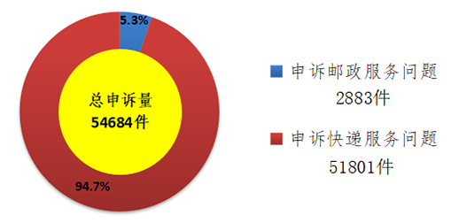 2019年4月,國家郵政局和各?。▍^、市)郵政管理局通過“12305”郵政行業消費者申訴電話和申訴網站共處理消費者申訴54684件。申訴中涉及郵政服務問題的2883件,占總申訴量的5.3%;涉及快遞服務問題的51801件,占總申訴量的94.7%。