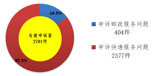 處理的申訴中,有效申訴量(確定企業責任的)為2781件,比上年同期下降68.9%。有效申訴量中涉及郵政服務問題的404件,占有效申訴量的14.5%;涉及快遞服務問題的2377件,占有效申訴量的85.5%。