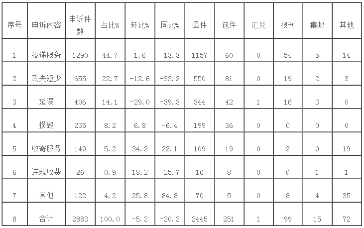 郵政業消費者對郵政服務申訴的主要問題是投遞服務、郵件丟失短少和郵件延誤,分別占申訴總量的44.7%、22.7%和14.1%。郵政服務問題申訴量環比增長的是收寄服務、違規收費和損毀問題,同比增長的是收寄服務問題。