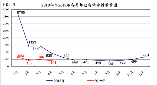4月,郵政業消費者對郵政服務問題申訴2883件,環比下降5.2%,同比下降20.2%。