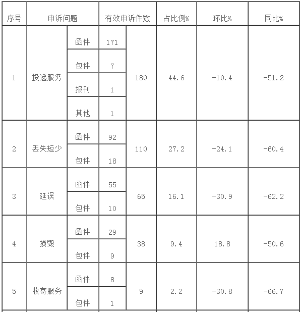 郵政業消費者對郵政服務問題有效申訴404件,環比下降17%,同比下降56.5%。