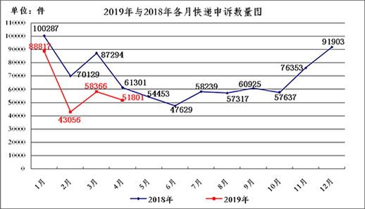 4月,郵政業消費者對快遞服務問題申訴51801件,環比下降11.2%,同比下降15.5%。