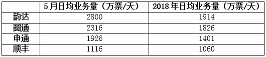 按日均業務量來看,除順豐外,余下3家快遞公司5月的表現均明顯高于2018年。其中,韻達2800萬票/天,逼近3000萬票/天。其最有希望成為中通之后第二家破“3”的企業。