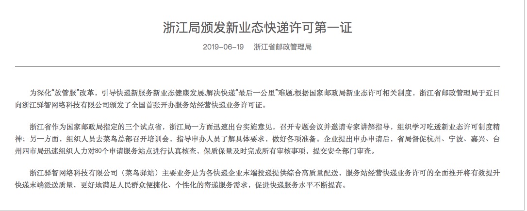 浙江驛智網絡科技有限公司(菜鳥驛站)主要業務是為各快遞企業末端投遞提供綜合高質量配送,服務站經營快遞業務許可的全面推開將有效提升快遞末端派送質量,更好地滿足人民群眾便捷化、個性化的寄遞服務需求,促進快遞服務水平不斷提高。