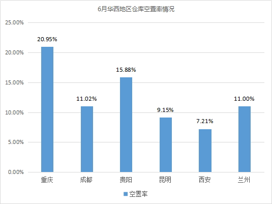 倉庫空置率最高的城市為重慶、南昌,均超過20%。相較5月,重慶倉庫空置率波動不大;南昌由于有部分高標庫投入市場,如江西中江國際物流(約9萬㎡)、南昌眾澤物流(1.2萬㎡)、蘇寧物流基地倉庫(超5萬㎡)等,導致倉庫空置率有所上漲,漲幅為7.05%。